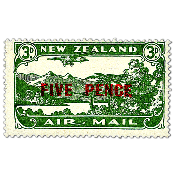 Time did not permit the production of a new plate and after proofs in green and in blue had been considered, a printing was run off of the 3d Airmail stamp issued earlier in the same year in yellow and green and the value changed by means of overprint. The inscription 'FIVE PENCE' was set up in type and a red surcharge was overprinted on the special printing.