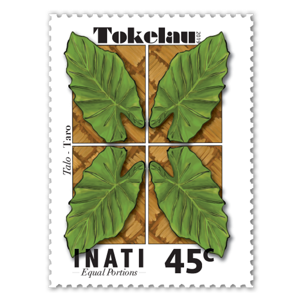 Single 45c 'Talo | Taro' gummed stamp. Taro is a staple in Tokelau, imported to the island from Samoa. The root of the taro plant is versatile and has a nutty flavour that works in both sweet and savoury dishes. |